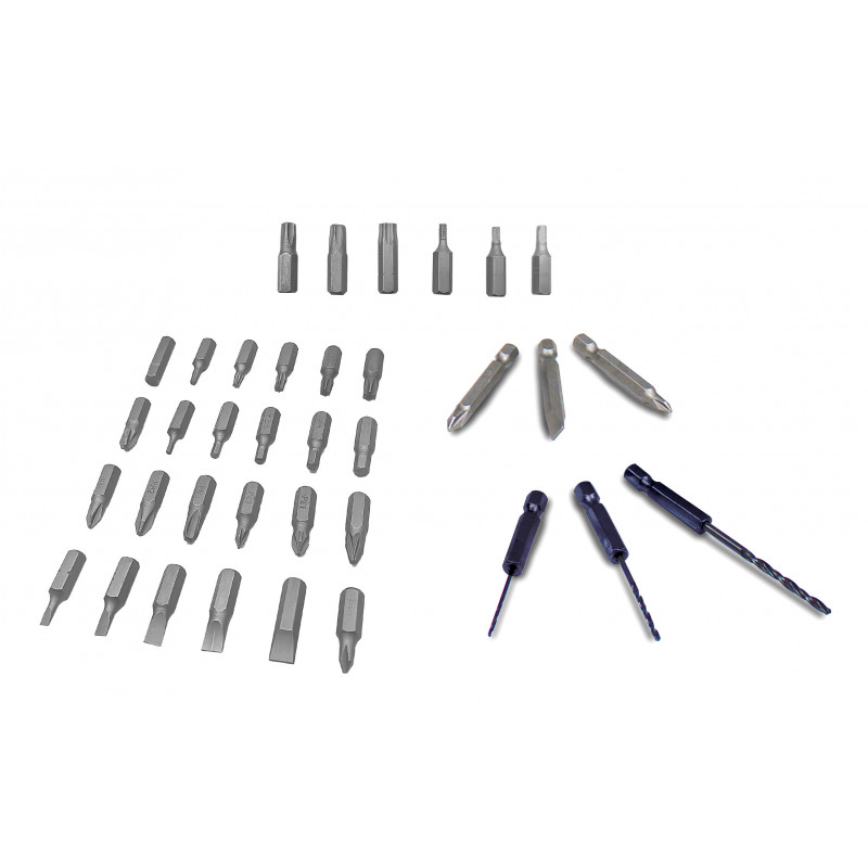 Vitesse à vide : 200 tr/minBatterie Lithium-IonCouple max: 3 NmDiamètre de vissage max: 6,35 mmDurée de charge : 3 à 5hEclairage LEDTémoin de charge LEDRéglage de couple : 23 positionsLivrée avec 1 chargeur pour batterie lithium-ion, 1 porte embout magnétique, 28 embouts de vissage 25 mm, 6 douilles, 3 embouts de vissage 50 mm et 3 mèches