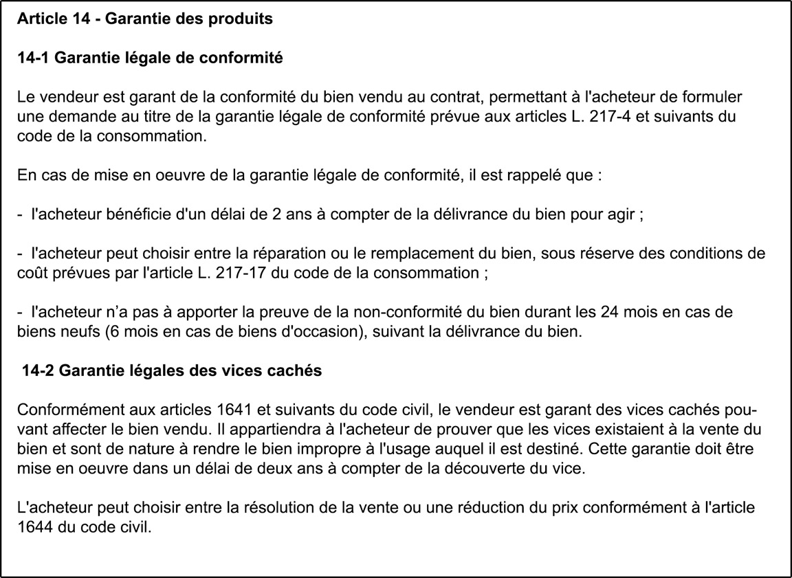 Les dispositions des articles L. 217-4, L. 217-5, L. 217-12 et L. 217-16 ainsi que l'article 1641 et le premier alinéa de l'article 1648 du code civil sont intégralement reproduites dans le contrat.